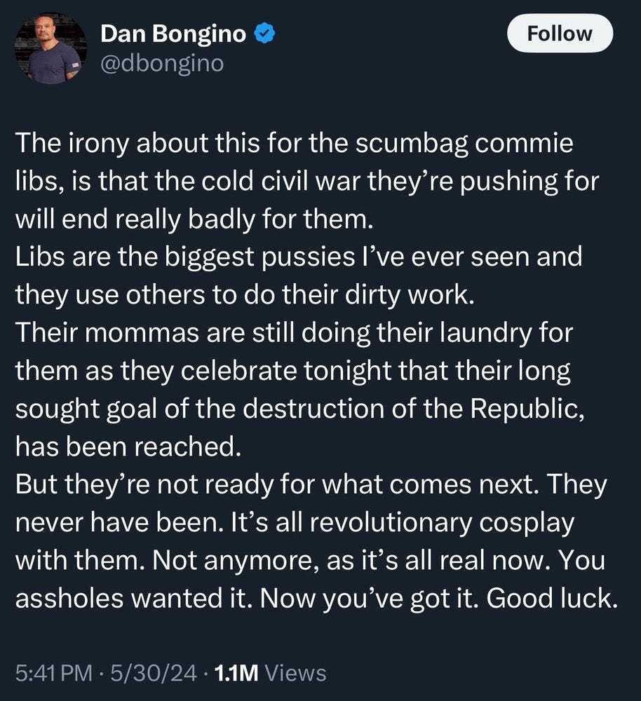 Then in May, after Donald Trump was convicted in the New York City hush money and cover up case, he posted this promise about a coming “civil war” with the “Libs.”